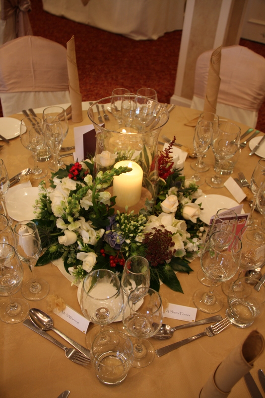 Some of the guest dining tables looked so elegant with a ring of fresh flowers including Antirhinnums, Hydrangeas, Roses, Astilbe, Eryngium, Agapanthus and Viburnum Opulus Berries surrounding a Hurricane Lamp containing a large pillar candle