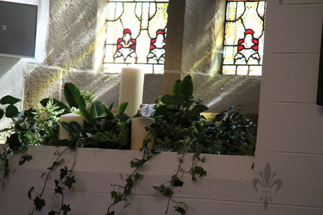 Into the safe surroundings of St Annes Church where we'd arranged a candle lit design on the Altar table, the design included Delphiniums, Peonies and Hydrangeas
