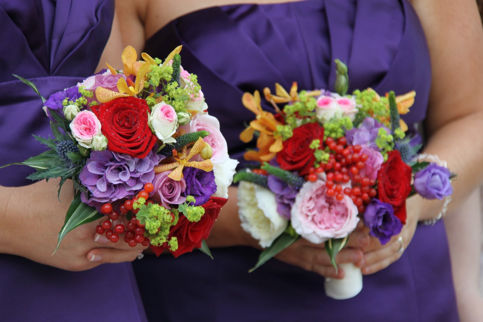 A Profusion of Indian Summer Colour was the order of the day, the Bridesmaids were wearing deep purple and their bouquets glistened with the jewels of Autumn